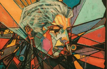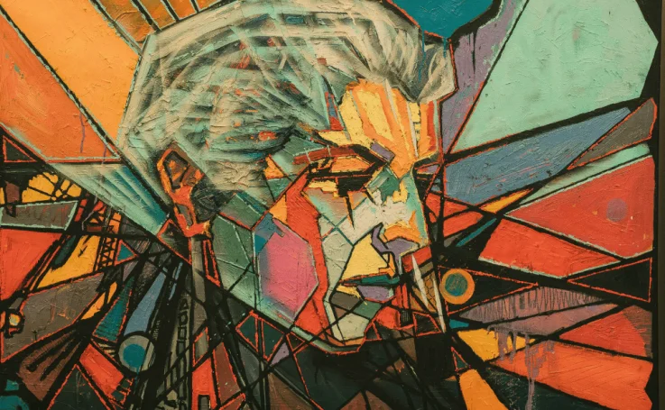 Barwny ekspresyjny, kubistyczny portret przedstawia profil twarz mężczyzny zwróconego w prawą stronę. Postać jest nierealistyczna, jej twarz została podzielona na nieregularne geometryczne kształty, które nachodzą na siebie i przenikają się.