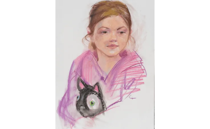 Ubrana jest w luźną różową bluzę, która jest tylko szkicowo nakreślona, jakby niedokończona, z widocznym dynamicznym kreskowaniem. Dziecko przytula maskotkę kota o szpiczastych uszach i nienaturalnie dużych okrągłych oczach w białych obwódkach. Lewe oko jest zielone, prawe niebieskie. Dziewczynka otula kota ramionami, również tylko schematycznie nakreślonymi szybkimi pociągnięciami pasteli.