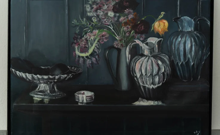 Po prawej stronie stoją dwa dekoracyjne szklane dzbany o pękatych kształtach i wyraźnie zaznaczonych żłobieniach. Mają szerokie wlewy i duże pojedyncze uchwyty. Pierwszy, jaśniejszy znajduje się bliżej środka obrazu i nieco przysłania wazon z kwiatami. Widoczne na nim różowo-białe refleksy wyróżniają się pośród przygaszonych zimnych kolorów. Drugi dzban stoi na małym pudełku i namalowany został tuż przy krawędzi pracy. Ma granatowo-szary odcień.
