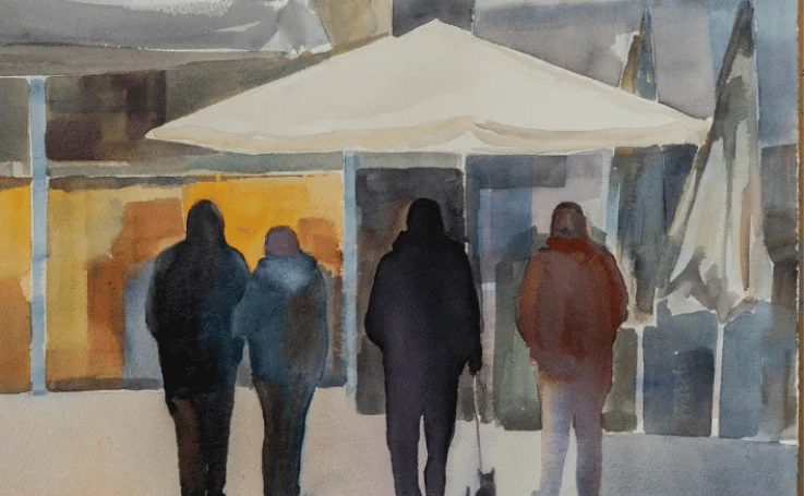 Akwarela przedstawia cztery osoby ukazane od tyłu. Idą obok siebie przez miejski plac, być może rynek, w kierunku zabudowań w głębi. Przed nimi na środku kompozycji znajduje się rozłożony kremowo-biały parasol z kawiarnianego ogródka. Fragment drugiego, szarego i nieco większego parasola wyłania się z lewej strony.