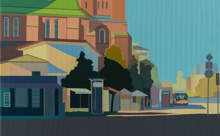 Na pierwszym planie przed kościołem przy szerokiej ulicy znajdują się niewysokie budynki usługowe. Ich geometryczne uproszczone sylwetki zasłaniają nieco bryłę świątyni. Pomiędzy zabudowaniami rosną ciemno-zielone drzewa. W głębi, na prawo dostrzec można przystanek autobusowy i stojący przy nim żółto-czerwony autobus. Za przystankiem daleko w tle majaczą kształty wysokich budynków w jasnych, pastelowych barwach.