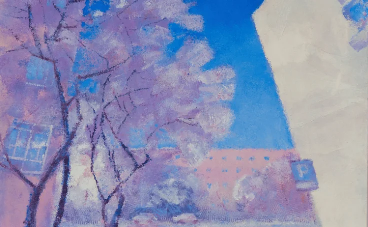 W tle kompozycji znajduje się zabudowa przy głównej ulicy namalowana za pomocą rozmytych plam. Za drzewami wznosi się długi budynek, którego masywna bryła zasłania horyzont. Przy ulicy majaczą sylwetki zaparkowanych samochodów. Nad zabudową rozciąga się intensywnie niebieskie niebo.